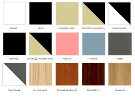Возможные цвета кроваток: белый, слоновая кость, венге, венге/слоновая кость, венге/белый, шоколад, шоколад/слоновая кость, розовый, голубой, серый, серо-белый, натуральный, темный мед (орех), вишня (бук), карамель.
