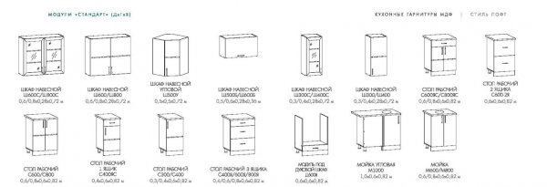Глубина верхних шкафов указана без учета фасада, высота столов указана без учета столешницы