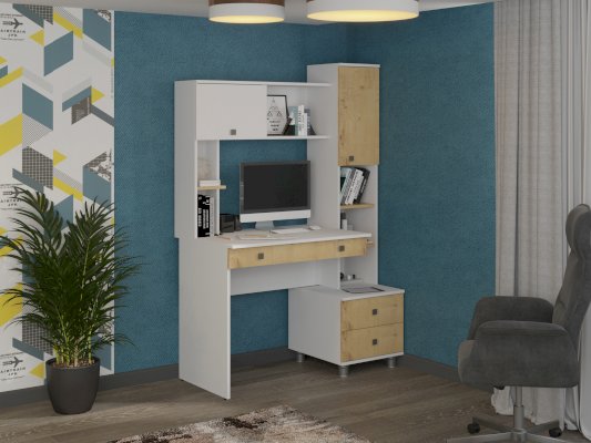 В этой функциональной модели предусмотрено все, что нужно для эффективной организации рабочего места. В нижней части имеются два выдвижных ящика для бумаг и канцелярских принадлежностей, надстройка содержит открытые полочки,а также распашные дверцы.