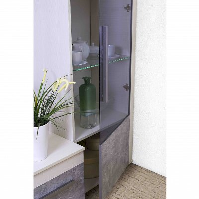 Если вы считаете, что хранить в гостиной посуду уже не модно, шкаф со стеклянной дверцей и стеклянными полками станет отличной витриной для дорогих и любимых фотографий и памятных вещиц. Стеклополки в обработке еврокромкой выдерживают до 10 кг каждая. Их можно декоративно подсветить с помощью светодиодной подсветки (в комплекте не поставляется, приобретается отдельно). Фасад перенавешивается на левую и правую сторону. Серебристая стильная ручка из массива дерева и серое тонирование стекло фасада вносят смелые дизайнерские штрихи в восприятии актуального декора "под бетон".