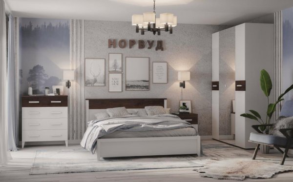 Двуспальная кровать из коллекции Норвуд выглядит свежо и современно. Модуль имеет лаконичный дизайн и простые геометрические формы, которые легко обыграть в интерьерах разных стилей. Выразительность кровати придают опоры со скосом и вставка в изголовье в декоре Орех Шоколадный. Основание для кровати - это самостоятельный модуль, поэтому докупается отдельно.