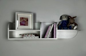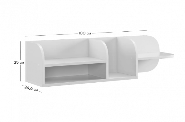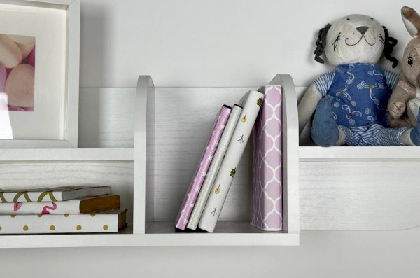 Полка состоит из прочного ЛДСП и имеет две открытые секции, которые удобно использовать для книг, игрушек, декора или учебных принадлежностей. Закруглённые боковые элементы придают конструкции мягкий, безопасный внешний вид, что особенно важно для детской комнаты.