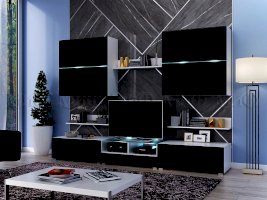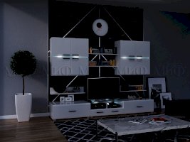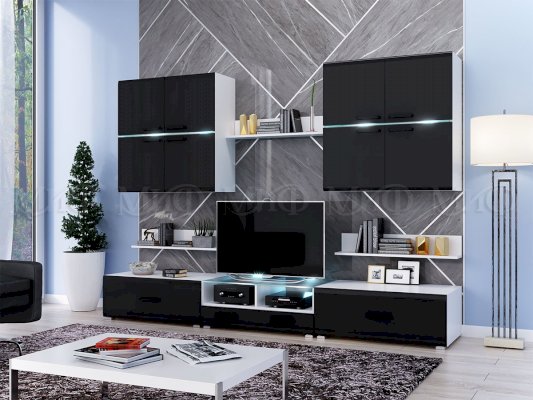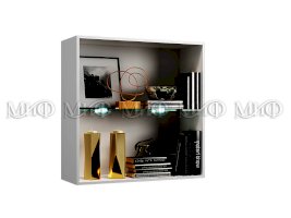 Шкаф навесной - внутреннее наполнение                  Цветовая гамма гостиной «Квадро» выделяет мебельную конструкцию ярким пятном на стене. Глянец и стекло придают помещению изысканности и воздушности интерьера. Современная гостиная «Квадро» — идеальное решение для любой квартиры.