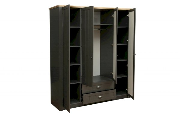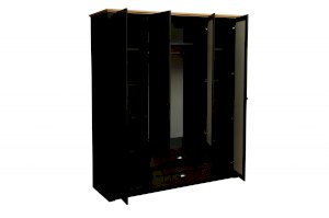 Четырехдверный шкаф с двумя выдвижными ящиками, в котором предусмотрен полный цикл хранения вещей всех категорий! Общая ширина шкафа – 1764 мм – позволяет разместить очень многое. По центру – две распашные дверцы, которые открываются навстречу друг другу. Внутри находится отделение для вещей, которые хранятся на вешалках. Прочная металлическая штанга выдерживает вес до 20 кг. Она находится на оптимальной высоте – человеку даже с очень небольшим ростом будет легко и просто повесть свою вещь. Над металлическим подвесом располагается вместительная полка – глубиной в 600 мм, способная выдержать вес до 5 кг. Здесь можно разместить вещи, которыми мы пользуемся не так уж и часто. Под центральным отсеком - два выдвижных ящика. Поскольку они находятся внизу, то лучше всего разместить в них коробки с обувью, но в конечном итоге – решать вам и размещать то, что необходимо – под индивидуальный запрос. По бокам – слева и справа – полки для вещей – в каждом отсеке по 5 полок. Полки выполнены из ЛДСП и выдерживают вес до 5 кг.