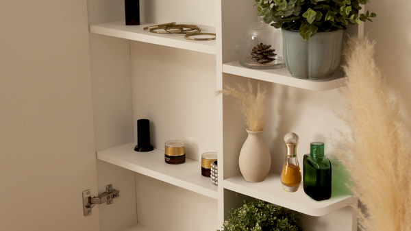 Несмотря на свои компактные размеры, туалетный стол имеет функциональный ящик с шариковыми направляющими для хранения парфюмерии, достаточно вместительную столешницу, где можно разместить все необходимые аксессуары и полноценное зеркало, которое имеет дополнительное место с полками для хранения за дверцей.