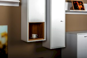 Гостиная модульная система сочетает в себе актуальные цвета и функциональную геометрическую форму с мотивами конструктивизма.
