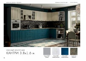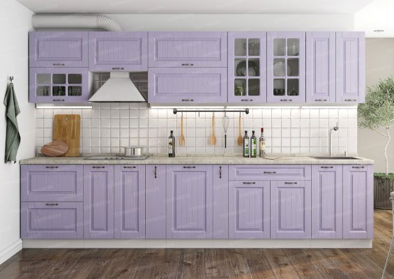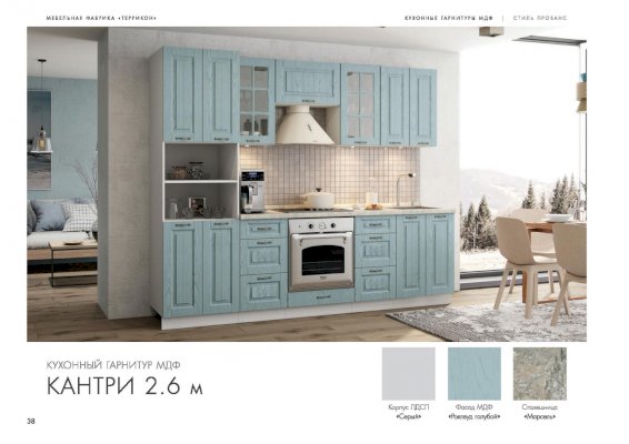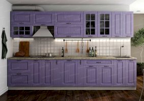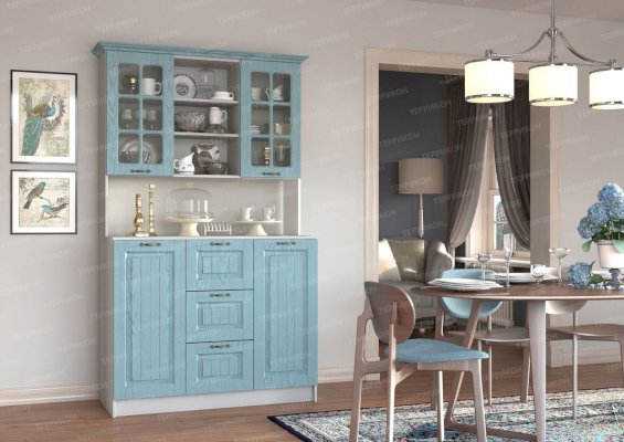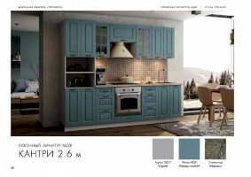 Ослепительная чистота и свежеть царят на кухне, обставленной мебелью из гарнитура «Кантри». Особую атмосферу создает отделка бирюзового, голубого, сиреневого цветов. Простой дизайн и хорошо различимая текстура натуральной древесины придает интерьеру деревенскую стилистку. Для изготовления комплекта использованы качественные и экологичные материалы.