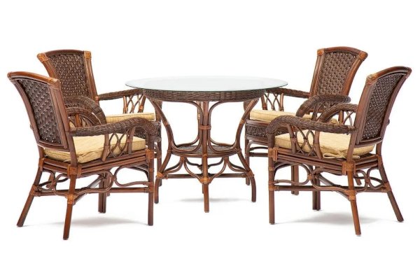 Изысканный обеденный комплект мебели Secret De Maison из коллекции ANDREA, состоящий из стола и четырех кресел, − идеальное решение для отдыха на загородном участке. Элегантные стулья с эргономичной спинкой, высокими подлокотниками, мягкой подушкой на сиденье и усиленным основанием каркаса обеспечат комфортный отдых и приятное времяпрепровождение на свежем воздухе. Устойчивый стол, дополненный нижней полкой, со столешницей из закаленного стекла добавит благородства и элегантности в оформление вашего сада. Стекло обладает повышенной прочностью, долговечностью, способно многие годы не утрачивать своей первоначальной привлекательности. Круглая форма стола располагает к приятному и непринужденному общению. Тканевая обивка подушек на сиденье проста в уходе, прослужит вам долгие годы, сохраняя свой первоначальный вид. Комплект выполнен из натурального ротанга с использованием нескольких видов традиционного индонезийского плетения и покрыт прозрачным матовым лаком, устойчивым к УФ-излучению. Он прочен, надежен, устойчив к повышенной влажности. Мебель идеально сочетается с изделиями из коллекции ANDREA, поставляется в собранном виде.