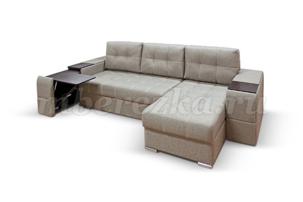 Угловой диван со столиком и выдвижными ящиками в подлокотниках «РИФ» завоевал среди покупателей большую популярность. Такая мебель значительно экономит пространство в помещении и, несомненно, делает отдых на диване комфортнее, ведь буквально под рукой есть раскладной столик в подлокотнике, на который можно поставить бокал, положить книгу или журнал, удобен при работе с ноутбуком. Другой подлокотник оборудован выдвижными полочками для хранения различных вещей. Большой ящик для белья внутри дивана, простой, и надежный механизм трансформации «тик-так» подтверждают функциональность этой модели. Блок независимых пружин, прошивка на сиденье – гарантия длительной эксплуатации дивана.