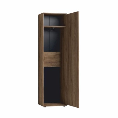 Распашной шкаф в декоре Дуб Табачный комплектуется штангой для одежды и полкой. Выдвижная штанга выдерживает нагрузку до 10 кг. К модулю Nature 71 можно докупить и установить Nature 72 Полки (в комплекте 3 полки) в заранее просверленные варианты присадки. Для удобства использования шкаф может собираться как на левую, так и на правую сторону.