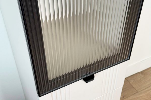 Корпус шкафа изготовлен из ЛДСП, что гарантирует прочность и долговечность. Фасад, покрытый МДФ в плёнке ПВХ, не только выглядит эстетично, но и защищает шкаф от повреждений. Особое внимание заслуживает фрезеровка фасадов, которая придаёт шкафу изысканный вид.